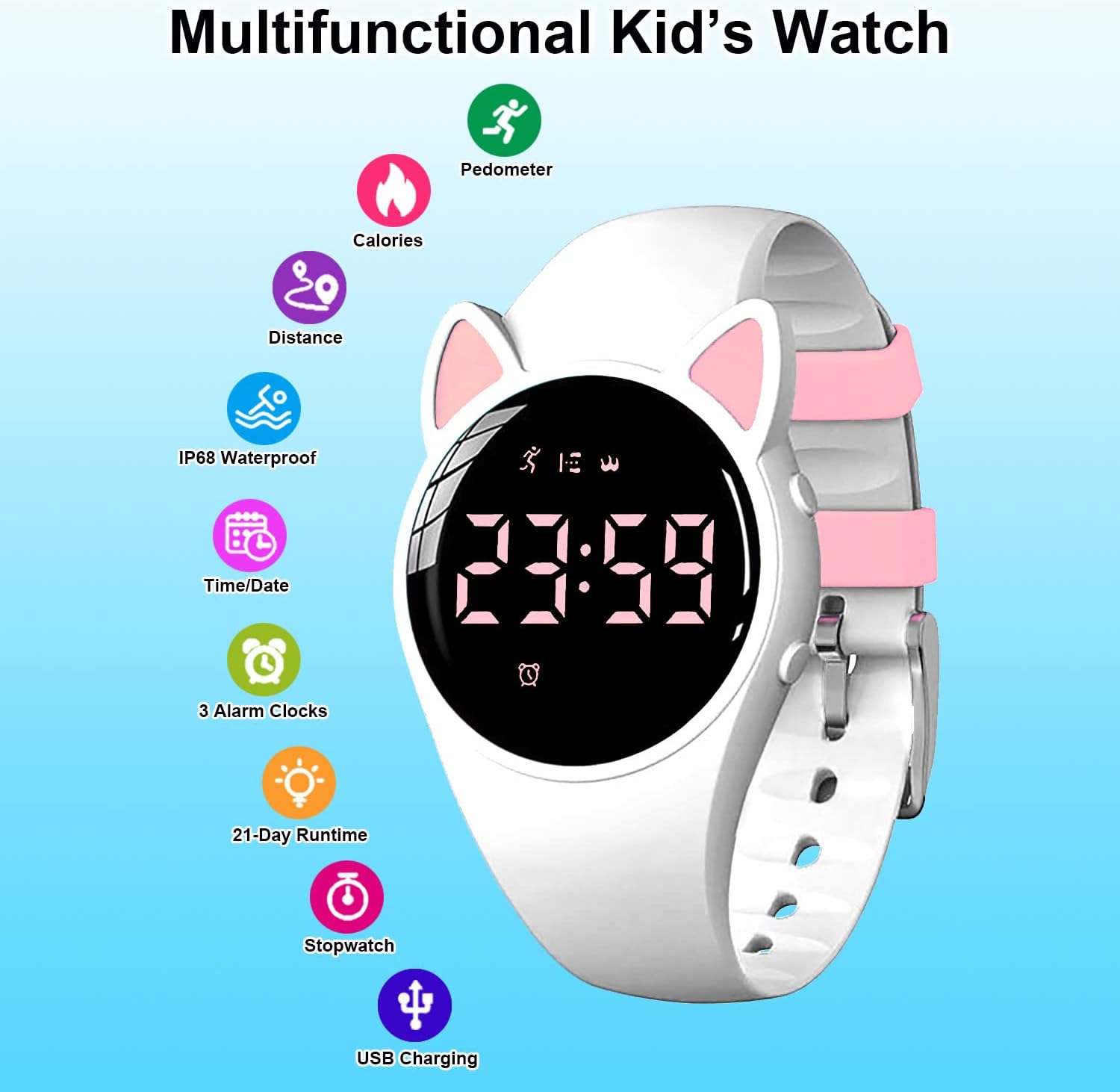 Cute 3D shape watch gift for children: the screen of this children’s watch shows the number and symbol in light pink, which is clearly visible even in the dark. The 3D cat shape and light pink display make this student watch very cute and special. This fitness tracker watch is a perfect gift for boys and girls.